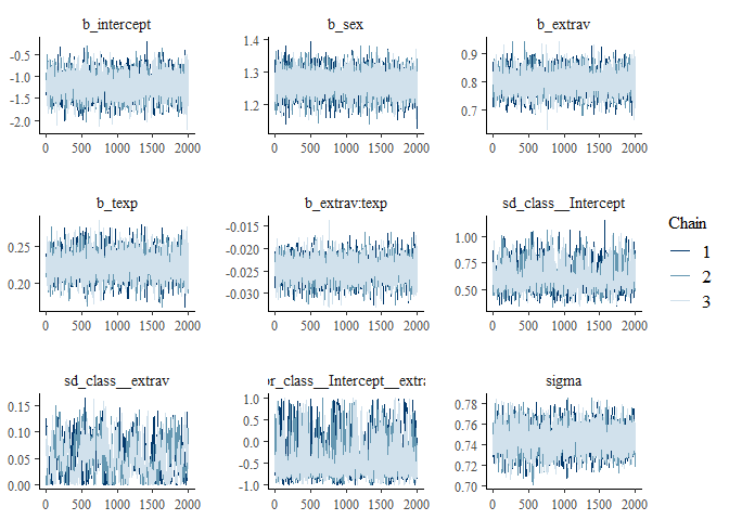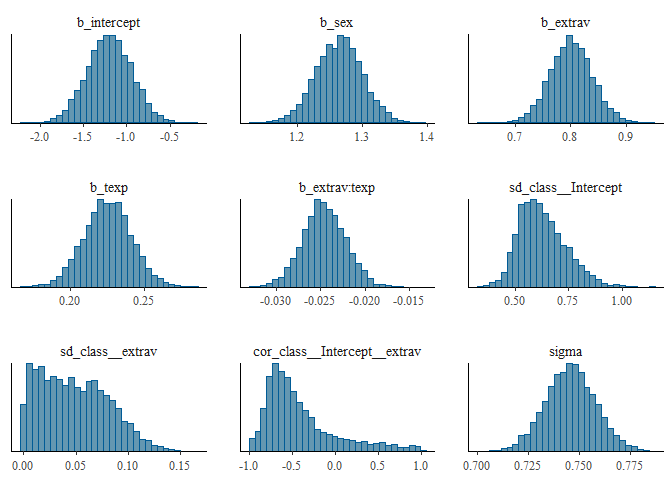 modeluninformativepriors<- brm(popular ~ 0 + intercept + sex + extrav + texp + extrav:texp + (1 + extrav|class),