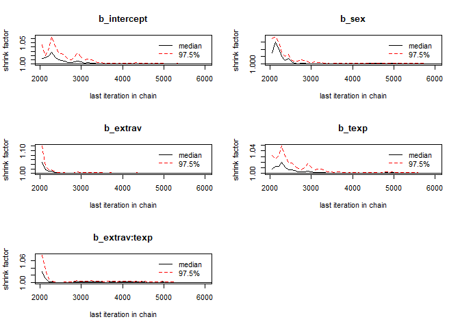 model <- brm(popular ~ 0 + intercept + sex + extrav + texp + extrav:texp + (1 + extrav|class),