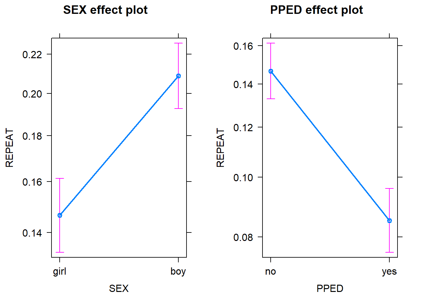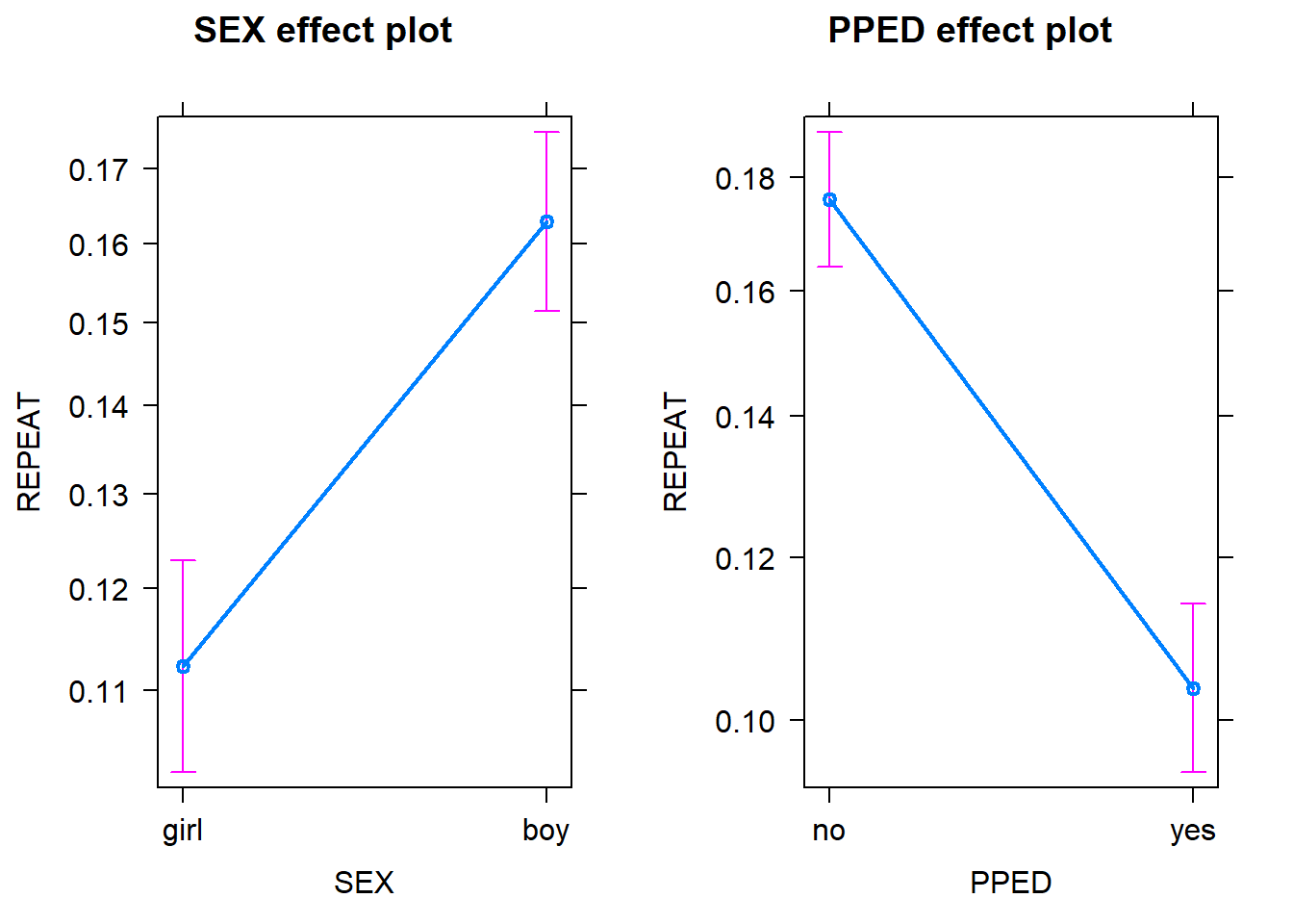 We can also use the allEffects function to visualise the effects of the parameter estimates. Note that because the first-level categorical variables (SEX and PPED) are centered, they are treated as continuous variables in the model and as well in the following effect plots.
