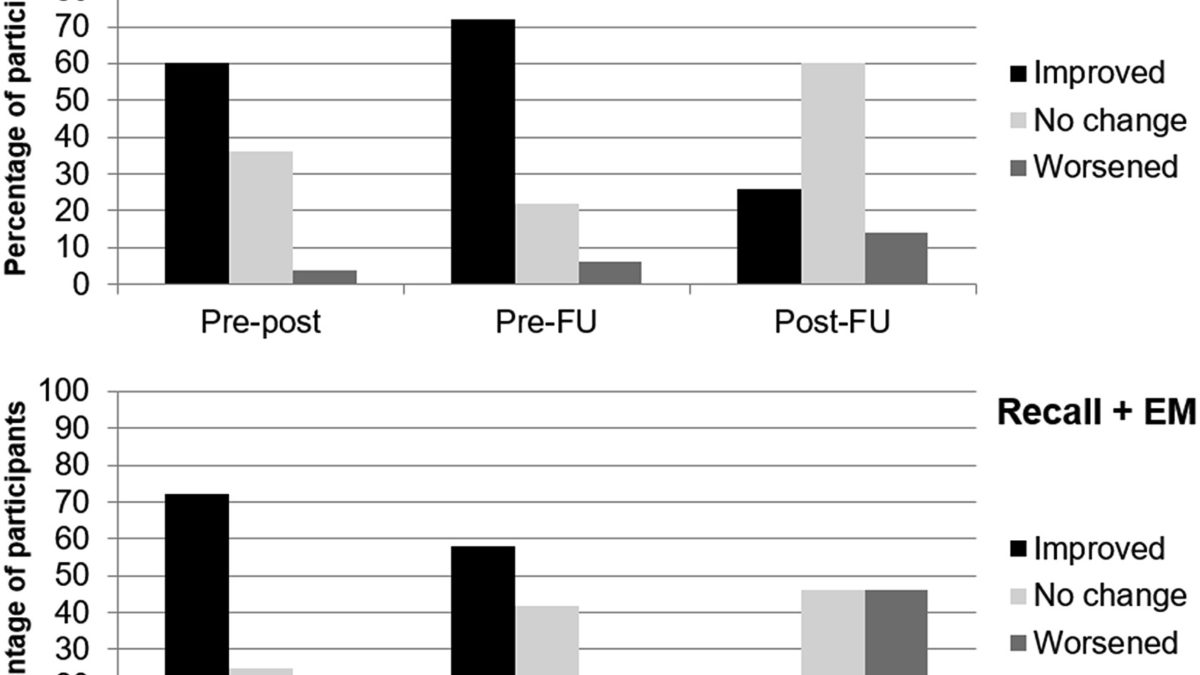 After 4 × 24s intervention, recall + EM resulted in memory deflation, while recall only caused memory inflation. After the full intervention (i.e., 32 × 24s), both conditions resulted in immediate and 24 h reductions on all outcome measures. Crucially, memory effects in the recall + EM condition partially relapsed 24 h later, while the effects in the recall only condition persisted. Change patterns were hardly explained by predictive variables.