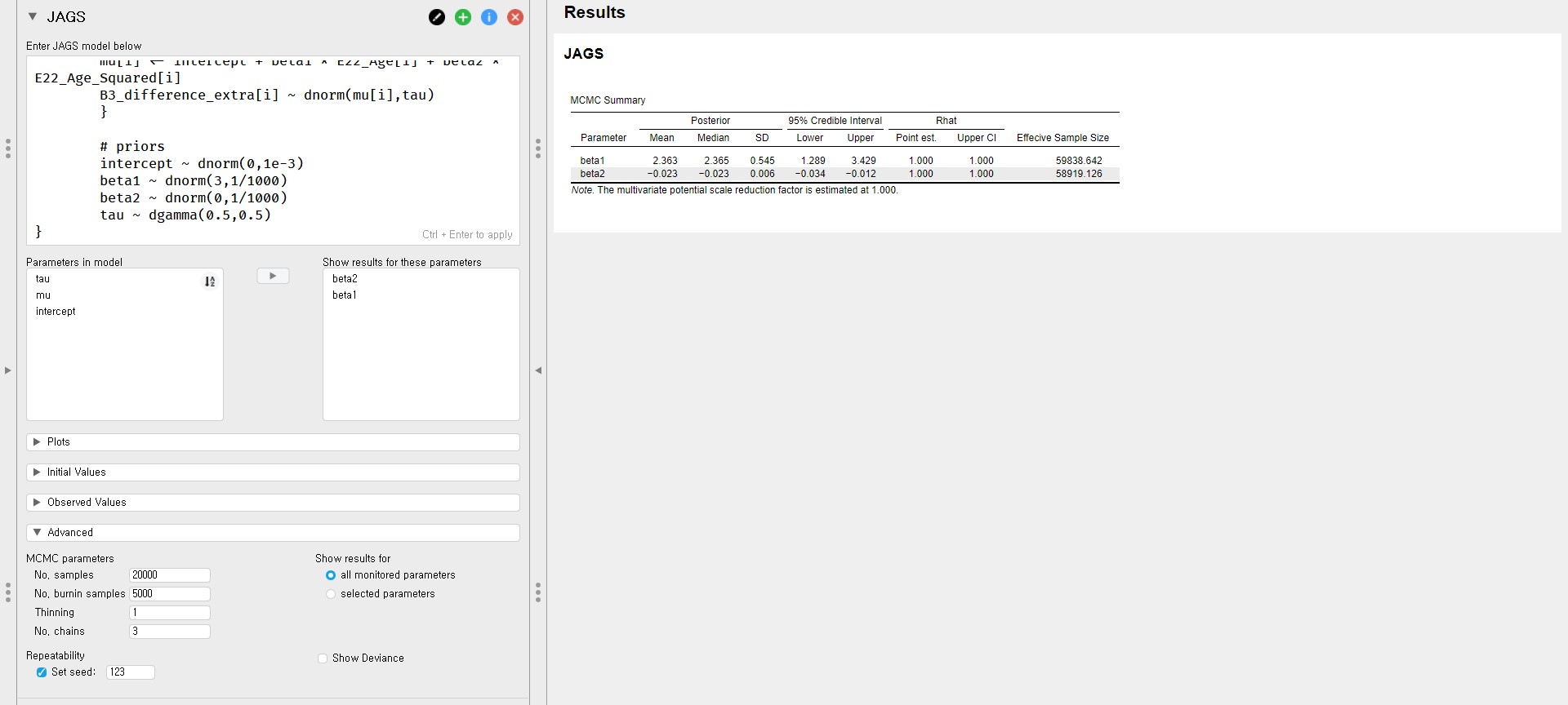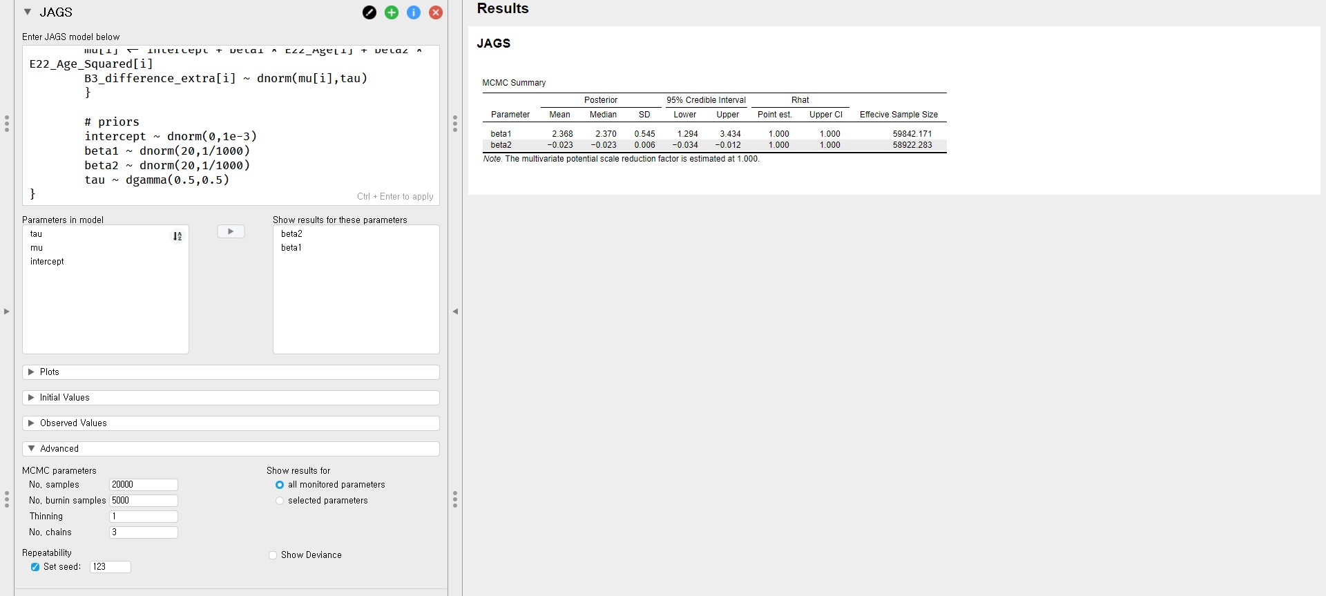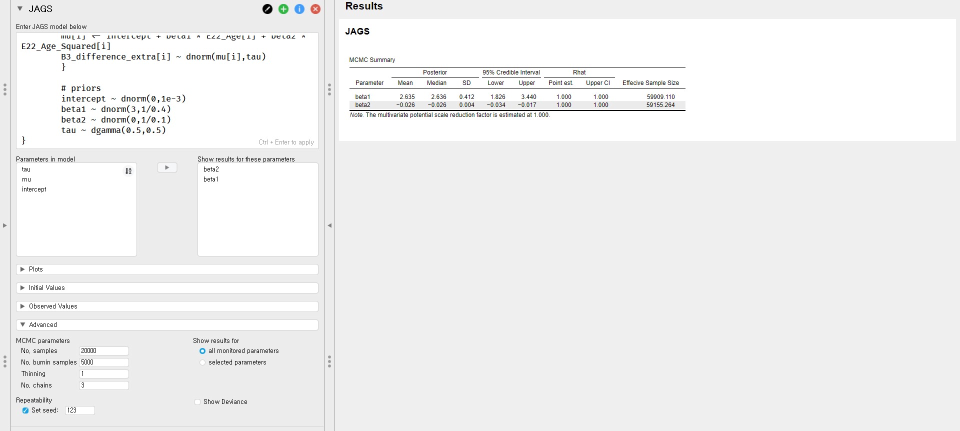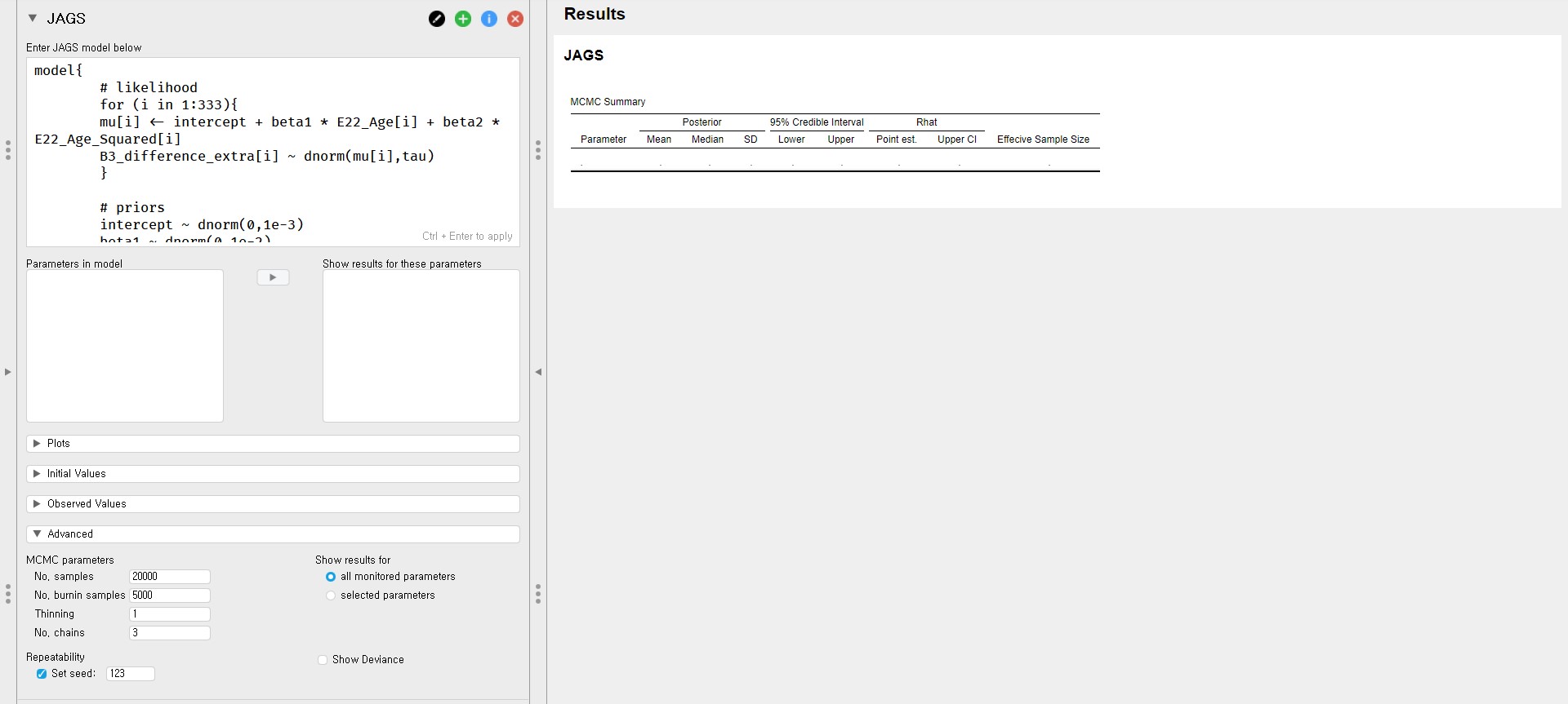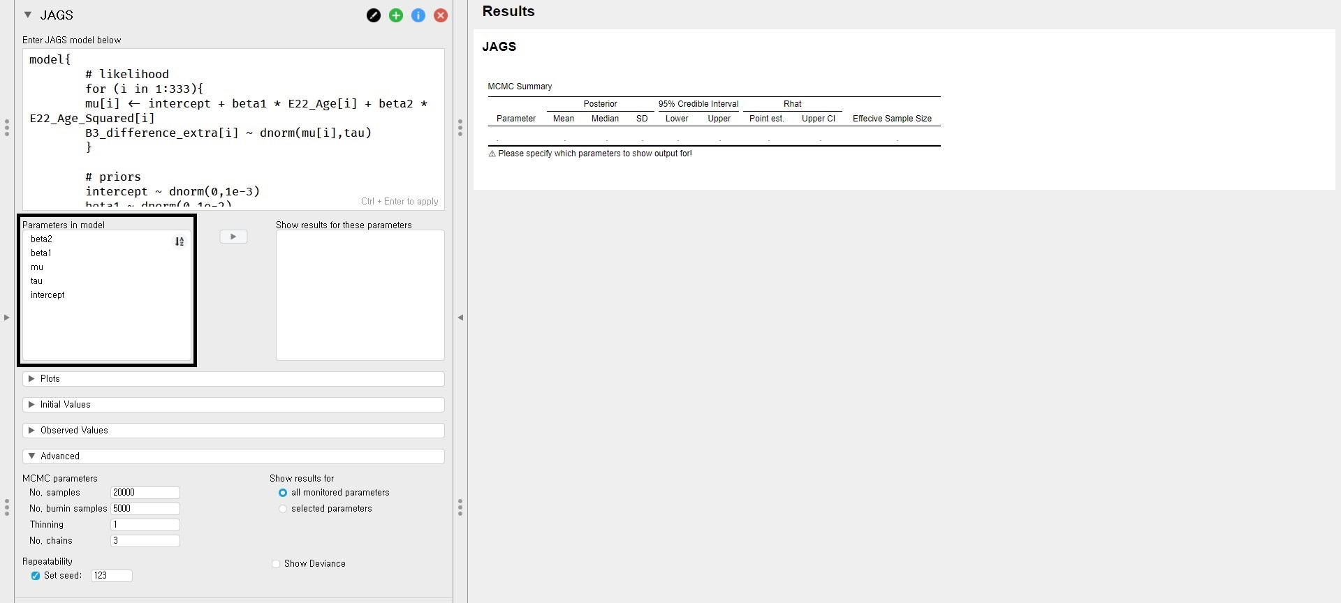 - Shortly, we can see a list of parameters under the Parameters in model in the control panel. This means that the posterior distributions for regression parameters are obtained by JAGS.