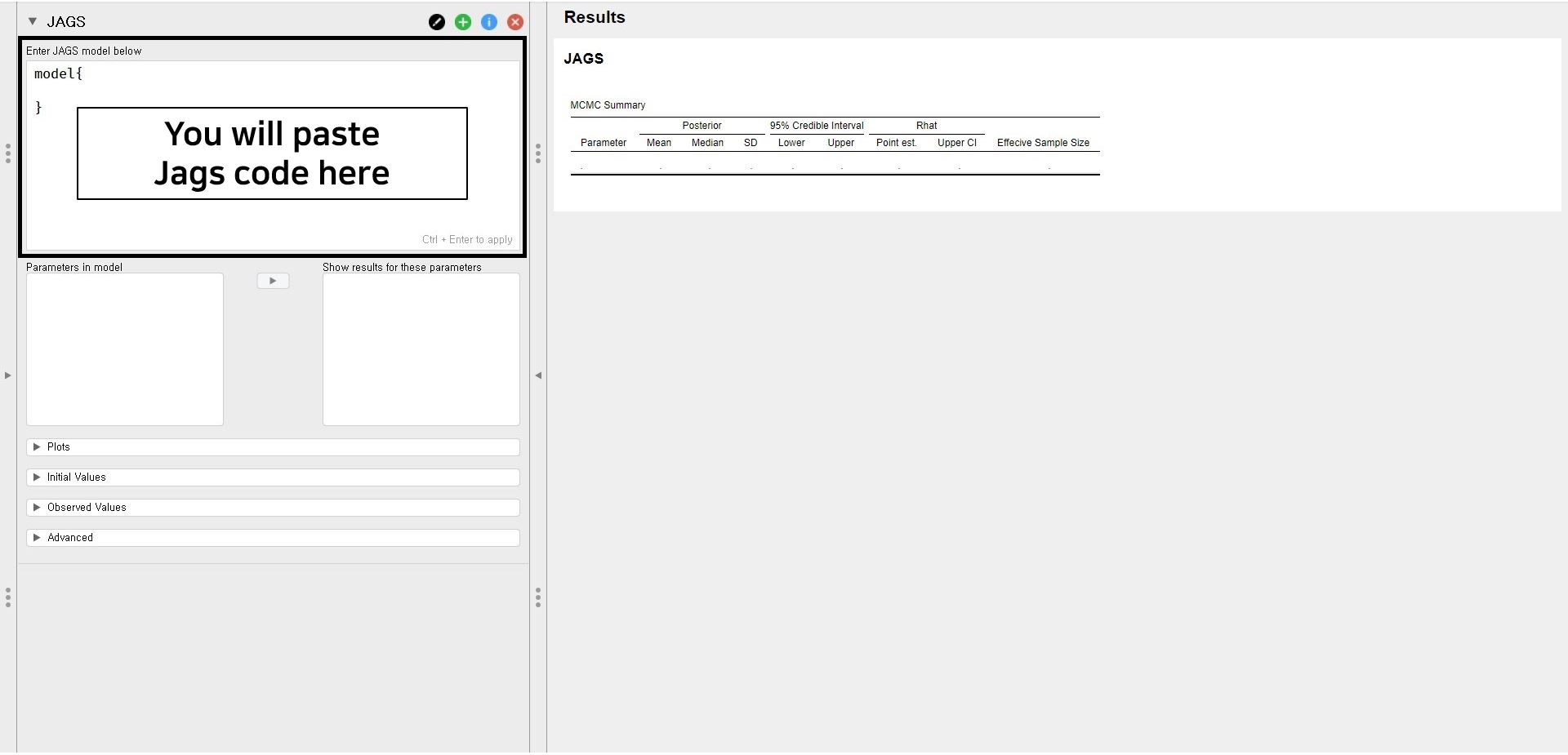 - Hope we are looking at the same screen! Go again to the code that we have pasted (i.e., the Enter JAGS model below section). Press Ctrl and Enter on the keyboard together to apply the code. With this action, you are running the model that we specified!