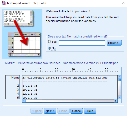 Be aware that you need to specify your own working directory in the third line of the code. Alternatively, you can read the data in through the user interface, by clicking File -> Open -> Data and choosing phd-delays.csv. A window will pop up as shown below. Be sure to tick that the dataset’s first line consists of the variable names.