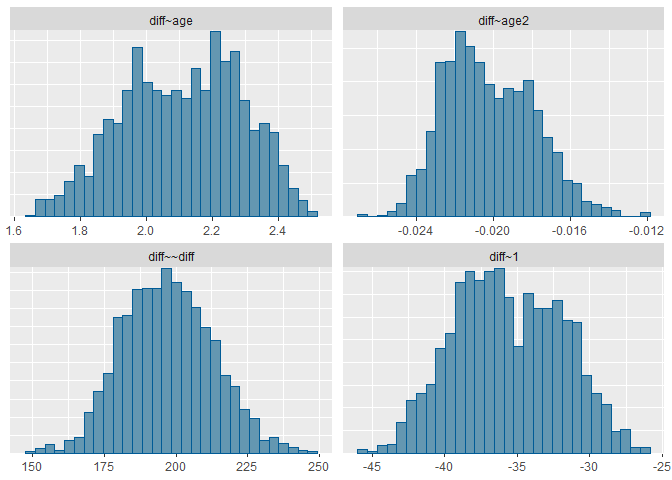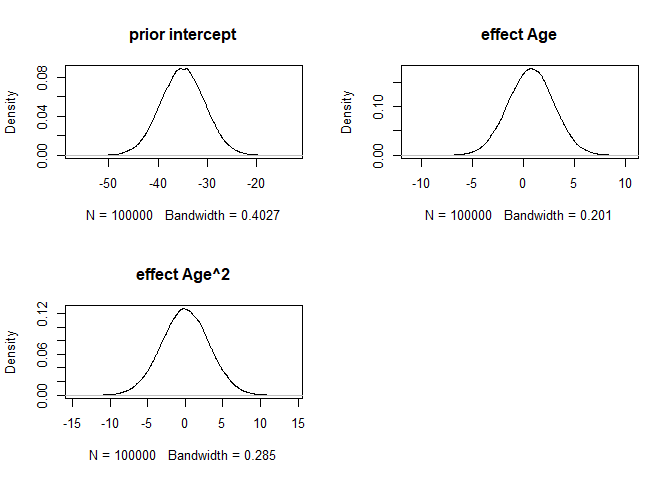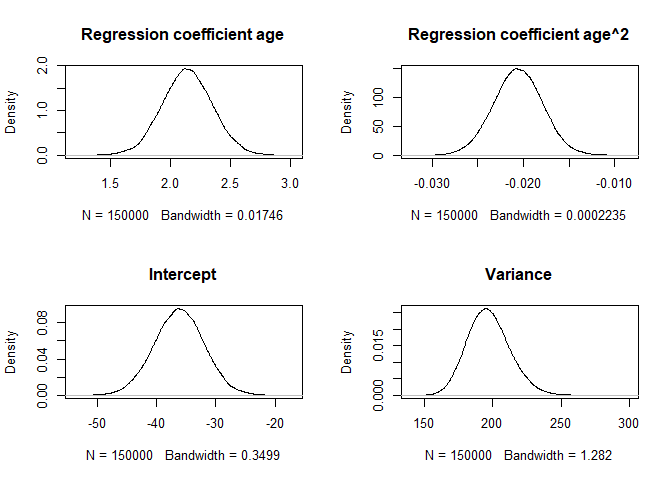 - the two regression parameters (\(\beta_1\) for the relation with AGE and \(\beta_2\) for the relation with AGE2)