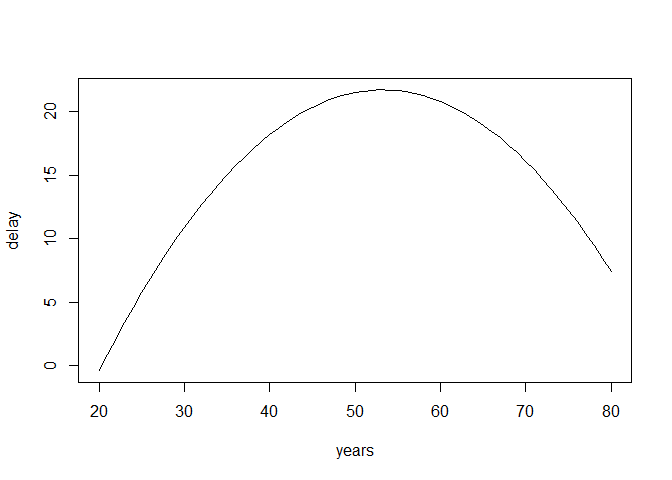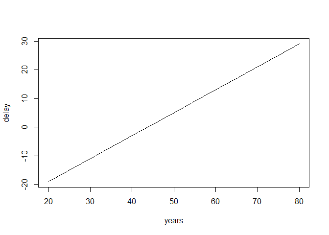 We can also plot what the expected delay would be (like we did in the Blavaan regression assignment) given these priors. With these priors the regression formula would be: \(delay=-35+ .8*age + 0*age^2\). These are just the means of the priors and do not yet qualify the different levels of uncertainty. Replace the ‘XX’ in the following code with the prior means.