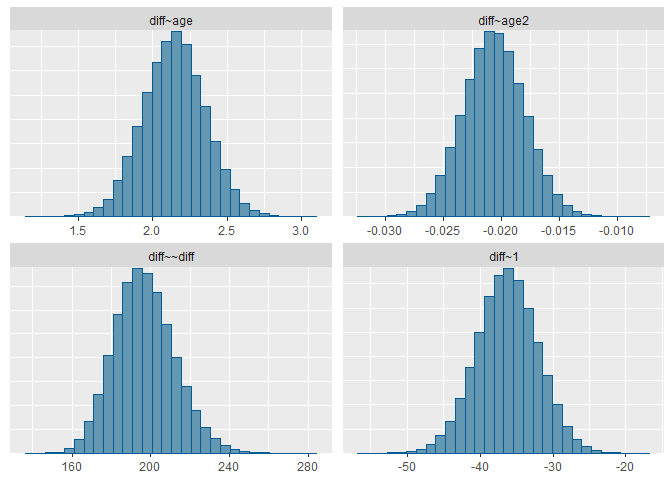 - The estimate for the effect of \(age\) is 2.141 [1.738 ; 2.564 ]